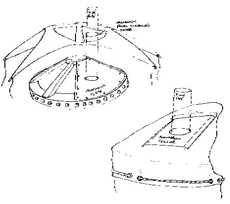 A metal woodburning stove is a much more practical solution. The smallest stove will provide more than enough heat. Both the stove and the flue-pipe will become extremely hot during use and any combustible material (wood or canvas) in contact with these will catch fire. Wood or canvas within a few inches of the stove or flue-pipe will rapidly char. To reduce any fire risk it is necessary to keep the flue-pipe separated from the frame and cover. This is achieved by making a collar of aluminium sheet. For a central stove remove one of the eight crown spokes and fill the gap with a piece of aluminium with a hole cut in it to take the flue-pipe. A similar aluminium sheet must be sewn or joined with Velcro to the crown cover. The use of Velcro allows the aluminium to be replaced with waterproof canvas or plastic if the stove is not in place. For a side mounted stove leave a space of at least 12 inches (30cm) between the stove and the wall. Remove one of the roof poles above the stove to leave a gap, cut a hole in the canvas in this space. Cut out an 18 inch (45cm) square of aluminium sheet with a round hole in the centre to take the flue-pipe. Smooth the edges and corners and bend the sides down slightly with the fold two inches (50mm) from the edge. Use Velcro to join this sheet to the canvas, make a flap in the cover to overlap this plate and allow water to run off ( Fig.11).