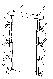The simplest and most portable door for your yurt consists of two uprights of willow or hazel 1½−3 inches (38–75mm) in diameter and four feet (1.2m) long tapered at each end to fit into 1 inch (25mm) holes drilled into the top and bottom of the frame. The top and bottom consists of lengths of the same wood about three inches (75mm) in diameter and two feet six inches (75cm) long drilled at either end to take the tapered ends of the uprights. The top part of the frame is drilled to take two of the roof poles. The door consists of a canvas curtain, weighted at the bottom. This frame is easily disassembled and strong (Fig.5).