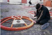 A more elaborate and weatherproof, but less portable door can be made with a solid timber frame, fitted with a double or single door, this is traditionally elaborately carved or painted. This door can be made in its own separate frame which can be fitted to the front of the hazel door frame when required. The making and decorating of such a door is beyond the scope of this book, so I will leave it up to you to consult a carpentry book or use your own imagination if you wish to furnish your yurt with such a grand entrance.
