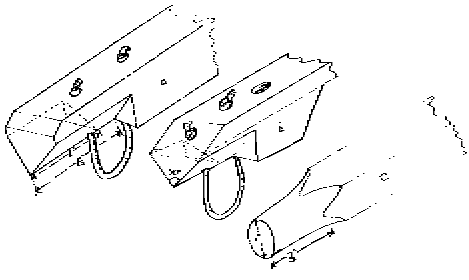 If you are using square or rectangular section timber either cut a the ends as shown in figure 8 or make blocks which can be glued and screwed to the end of the pole. Cut the sharp 90? top corner off at an angle of 45? and smooth with sandpaper. Drill two holes and fit string loops as for round poles. Ideally you should make square mortises in the crown to take the ends of the poles, but a much quicker and perfectly adequate option is to round off the top three inches of the poles with a knife or chisel to fit into the circular holes.